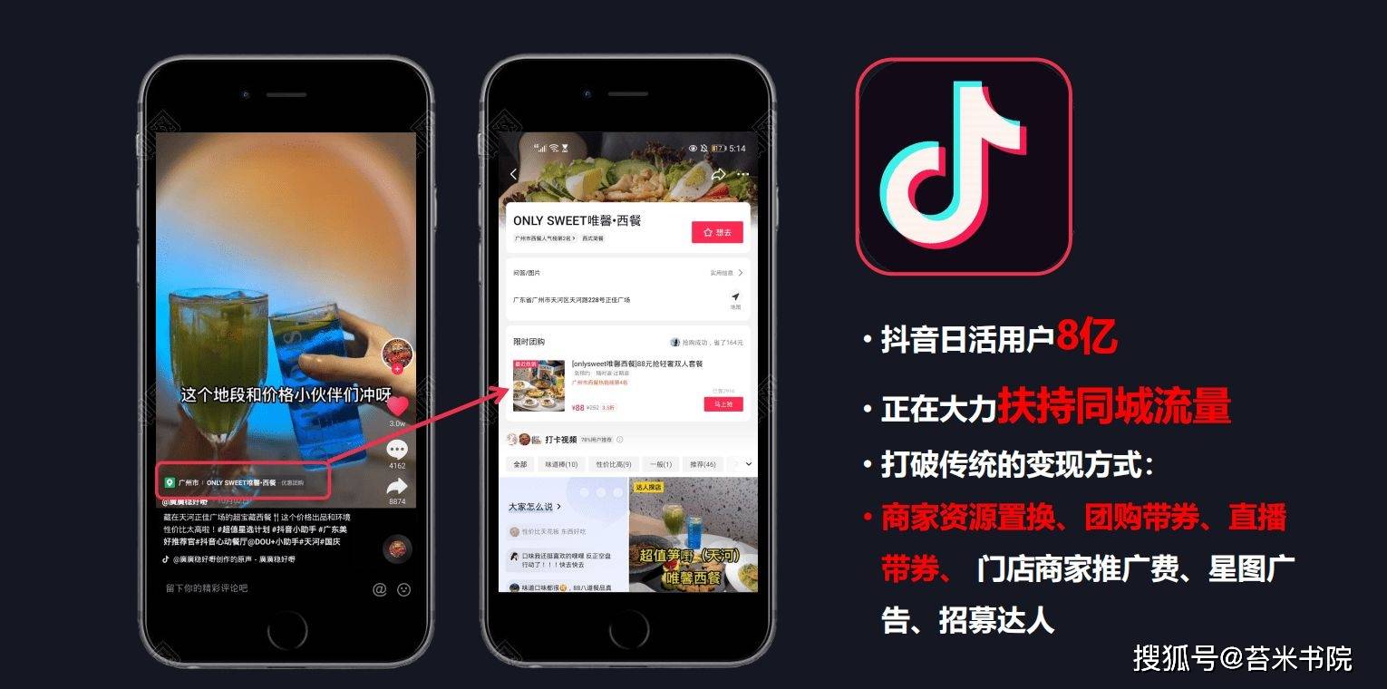 说通俗一点,就是抖音要把你身边的吃喝玩乐,以短视频形式再配合团购套餐或代金券展示在你面前,通过短视频线上曝光,引流消费者到线下体验服务。比如餐饮店的团购套餐、美业的代金券、景区的门票等等。