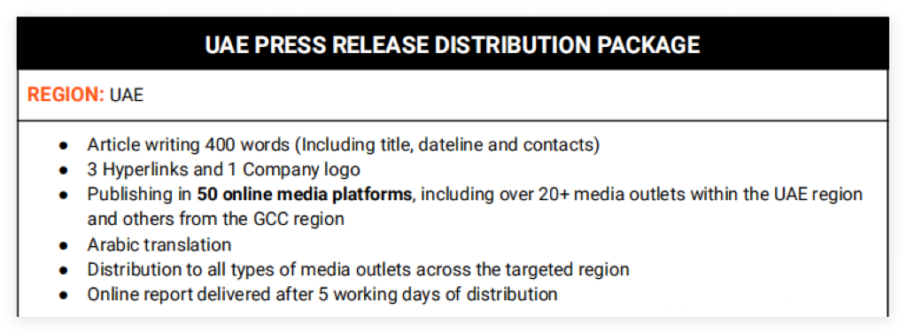 对于希望在文字稿基础上增加视觉元素的企业,套餐二提供了文字稿+1张图片的组合。同样覆盖50多家媒体,包括阿联酋及海湾合作委员会地区的其他国家。除了套餐一的权益外,图片的增加将使得新闻稿更加生动、吸引人,提升读者的阅读体验。