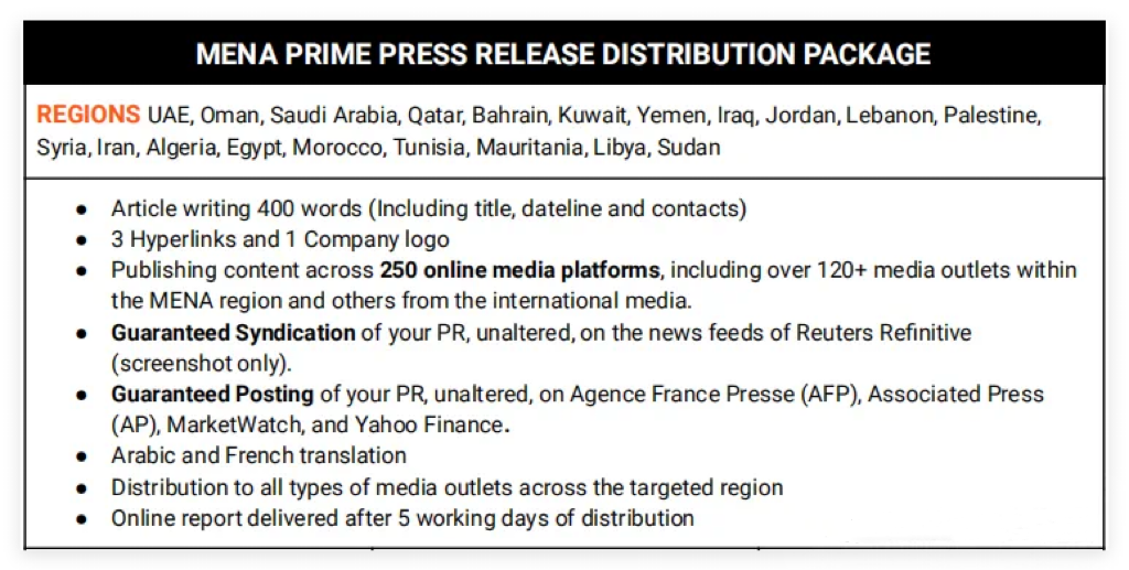 除了广泛的落地媒体覆盖外,苔米传媒的MENA套餐还特别注重与国际知名主流媒体的合作。客户的新闻稿将有机会被法新社、美联社、MarketWatch、雅虎财经以及路透社Refinitive等国际媒体平台推送,进一步提升信息的全球影响力和公信力。