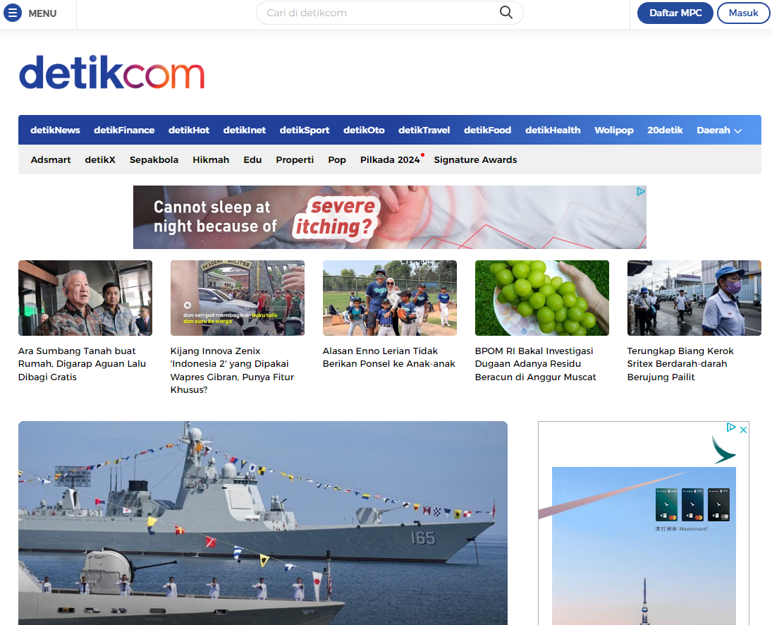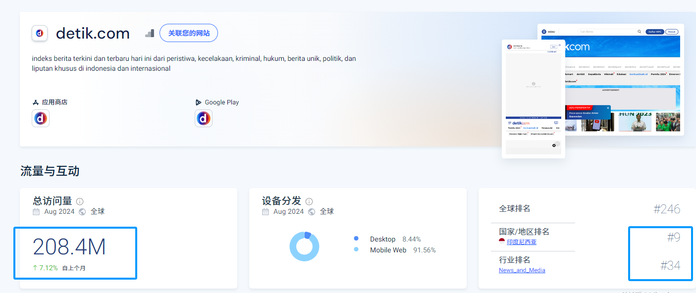 Detikcom作为印尼的综合性新闻媒体,其月访问量高达2.08亿,占据了印尼人口的74%,是印尼访问量最大的网站之一。其新闻内容涵盖广泛,包括新闻、教育、金融、网络、运动、旅游、食品、健康、音乐等多个领域,深受印尼民众的喜爱。