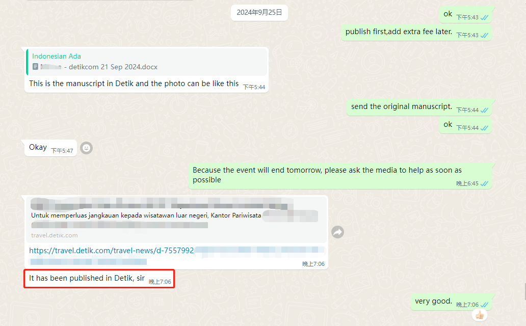值得一提的是,苔米传媒与Detikcom的合作并非首次。早在之前,苔米传媒就曾成功帮助一家旅游行业的客户在Detikcom上发布新闻,从提稿到成功发布仅用了不到两天的时间,且合作过程非常愉快。Detikcom的高配合度和发稿速度给苔米传媒留下了深刻的印象,而苔米传媒的专业服务和丰富经验也得到了Detikcom的认可。
