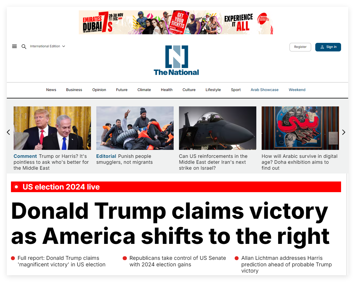《国家报The National》,自2008年创立以来,一直以其高质量的新闻报道为中东地区树立了标杆。该报每日从阿布扎比总部向全球英语受众传递最新的新闻、商业、艺术、文化、生活方式及体育资讯,深入的分析和独到的评论更是引领了该地区媒体的发展潮流。